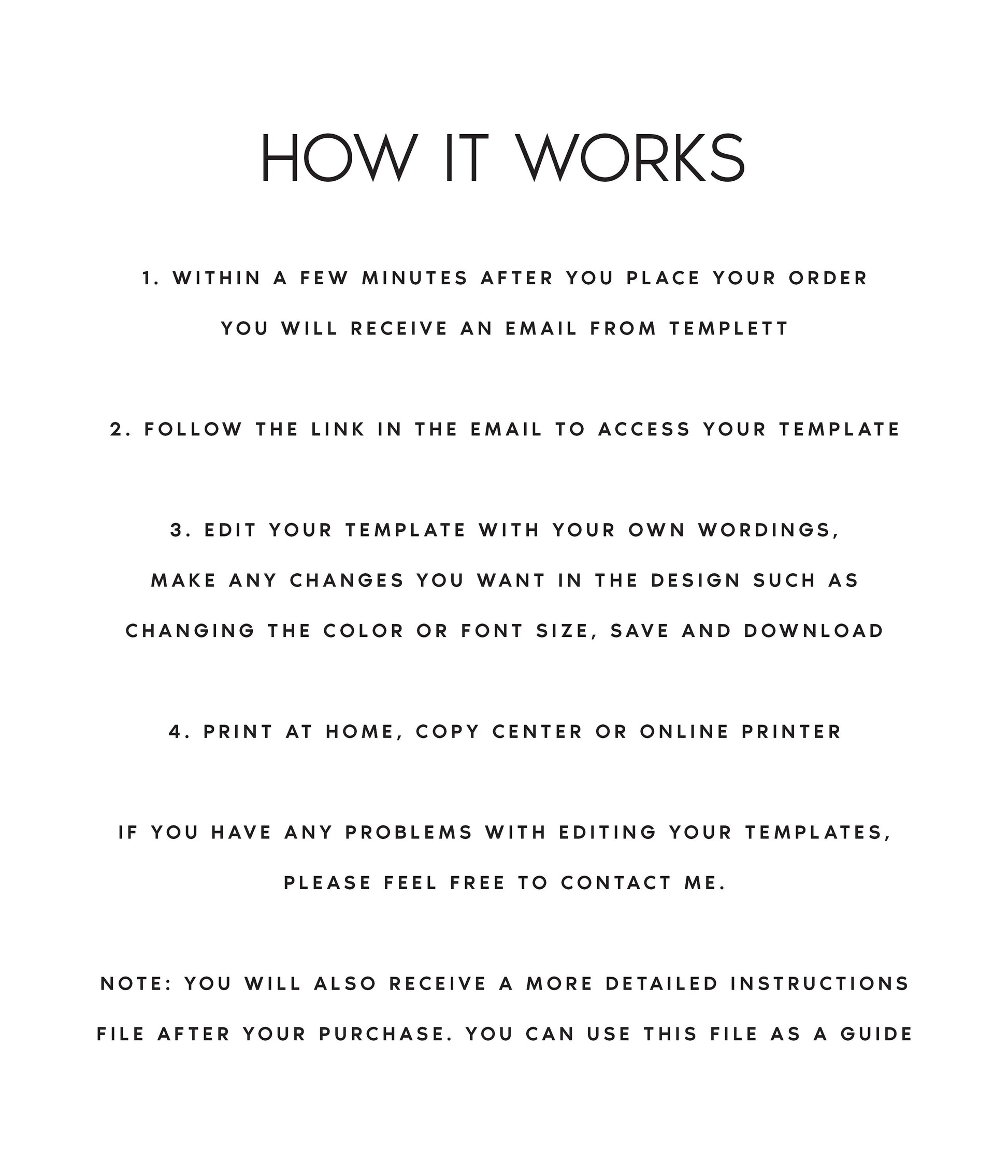 Please note that this is a DIGITAL DOWNLOAD only, no physical product will be shipped. You can easily print your templates at home, in a local printing shop or an online printer after editing. This template can also be used to send out ONLINE INVITATIONS – perfect to text, email or share on social media.
