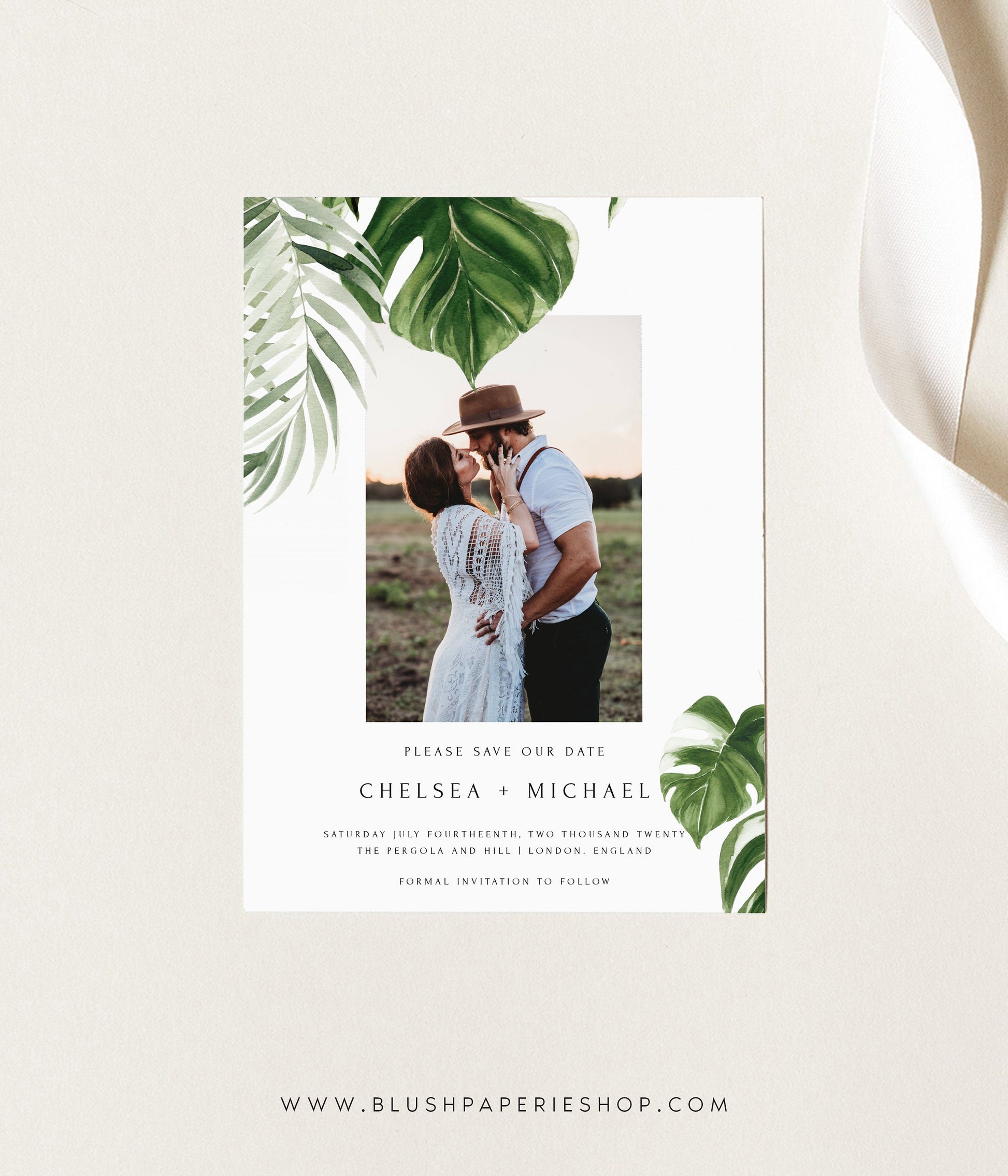 Tropical Photo Save the Date Template, DIY Printable Beach Wedding Save the Date, 100% Editable Text, Instant Download, Templett