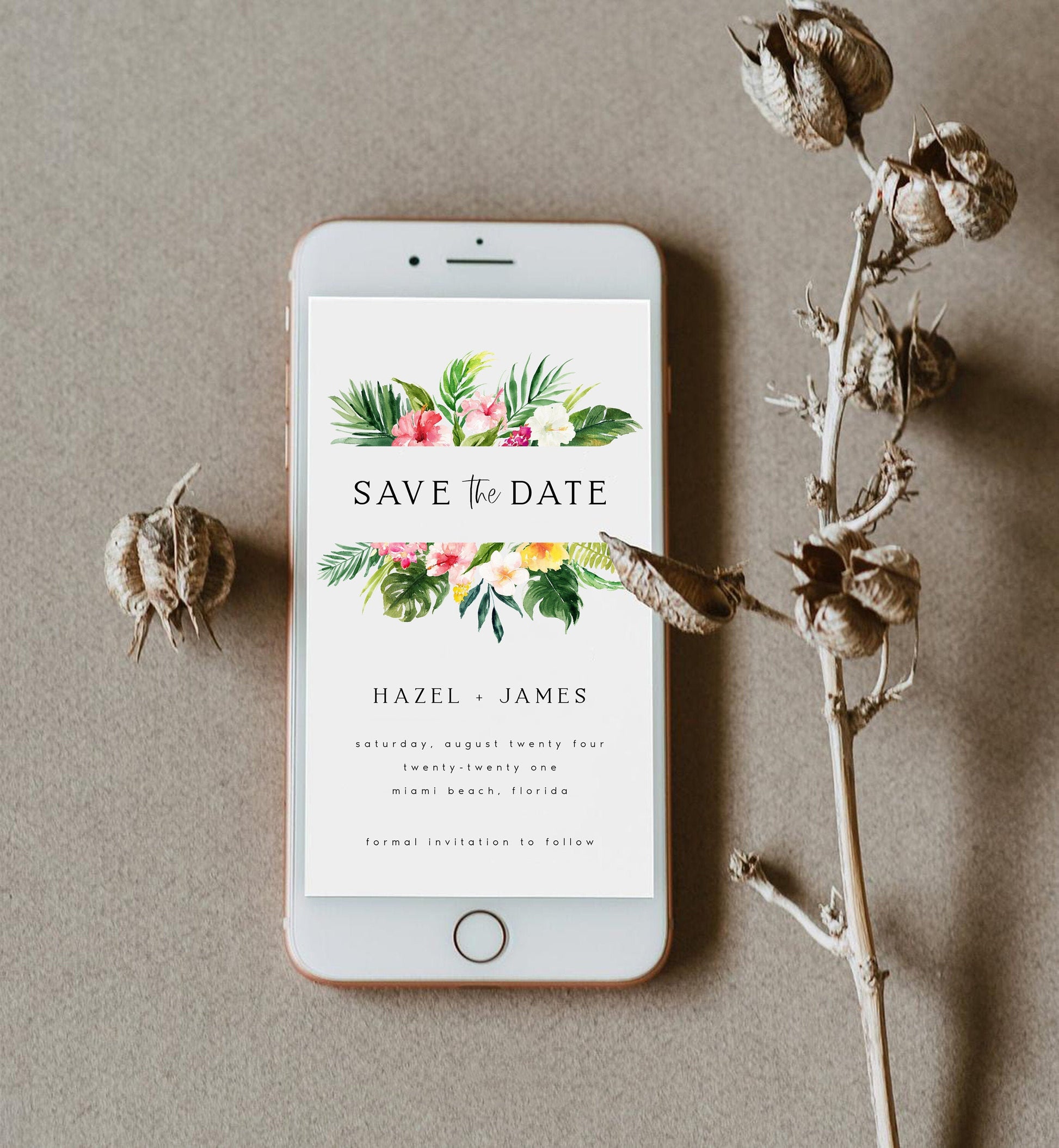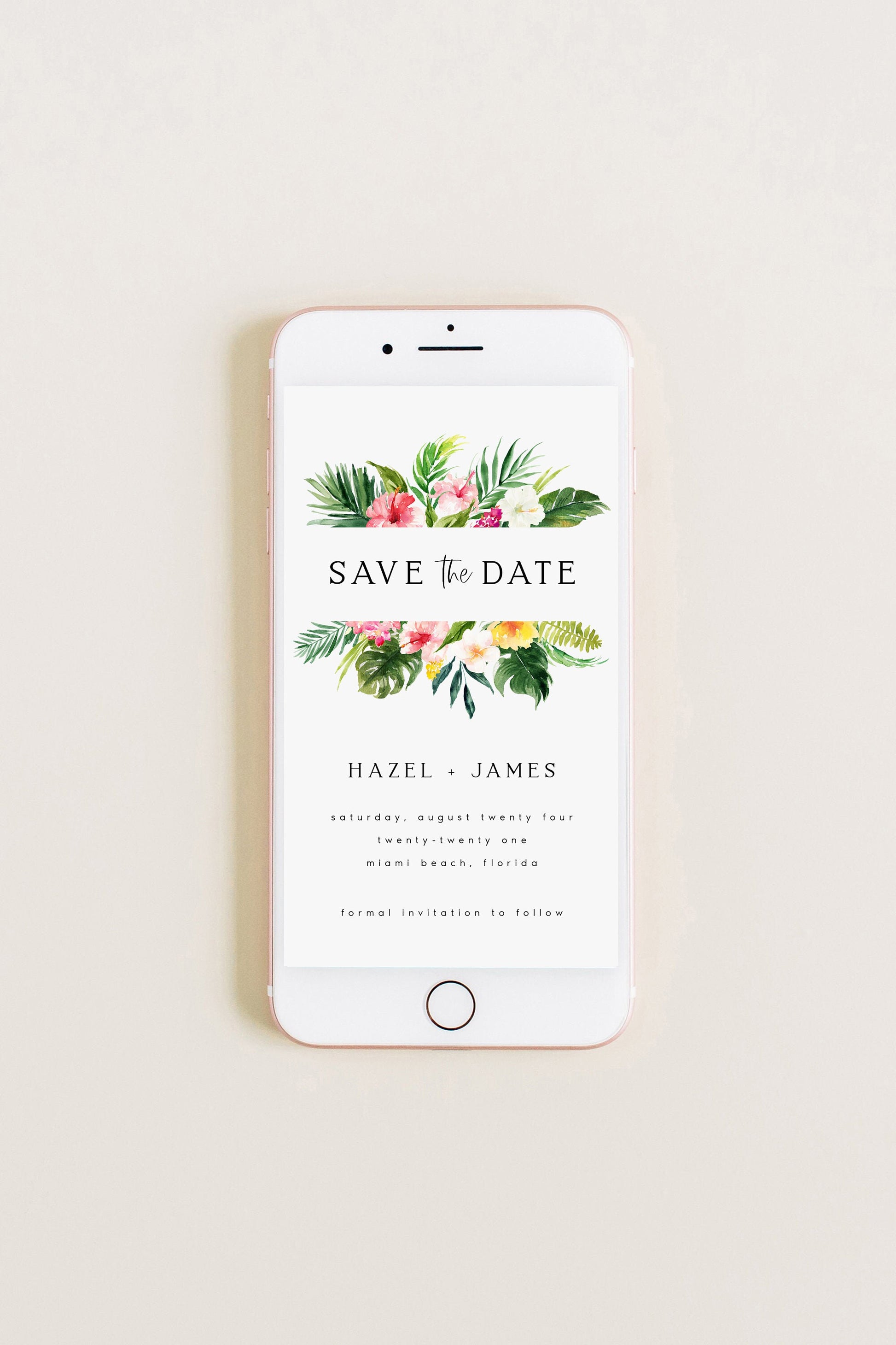 Tropical Save the Date Evite Template, Beach Wedding Digital Invite, Electronic Save the Date, Greenery & Pink Save the Date Evite, Instant Download Save the Date Evite, DIY Save the Date Evite.