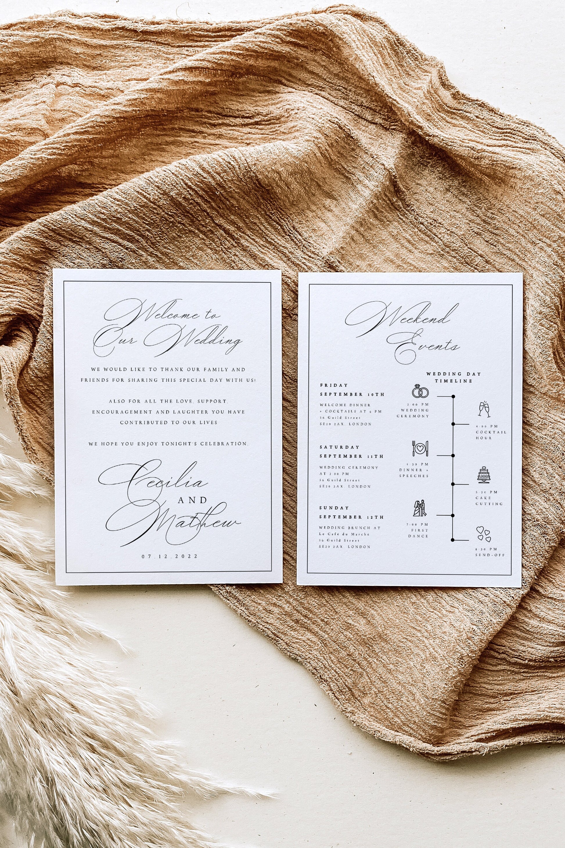This Classic & Elegant Wedding Itinerary Timeline Card Template is perfect for you if you are looking for a beautiful Printable Itinerary Template. This Traditional Wedding Weekend Itinerary Template is a perfect way to save on your wedding budget and you will love editing 100% EDITABLE TEXT within just minutes.
